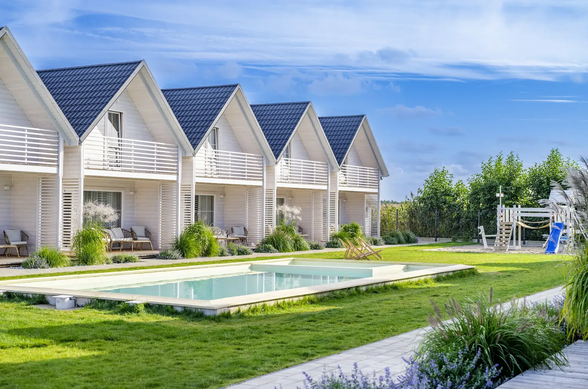 3. Obok piękny plac zabaw i trawnik. Przy każdym domku roślinki, tworzące oazę zieleni.