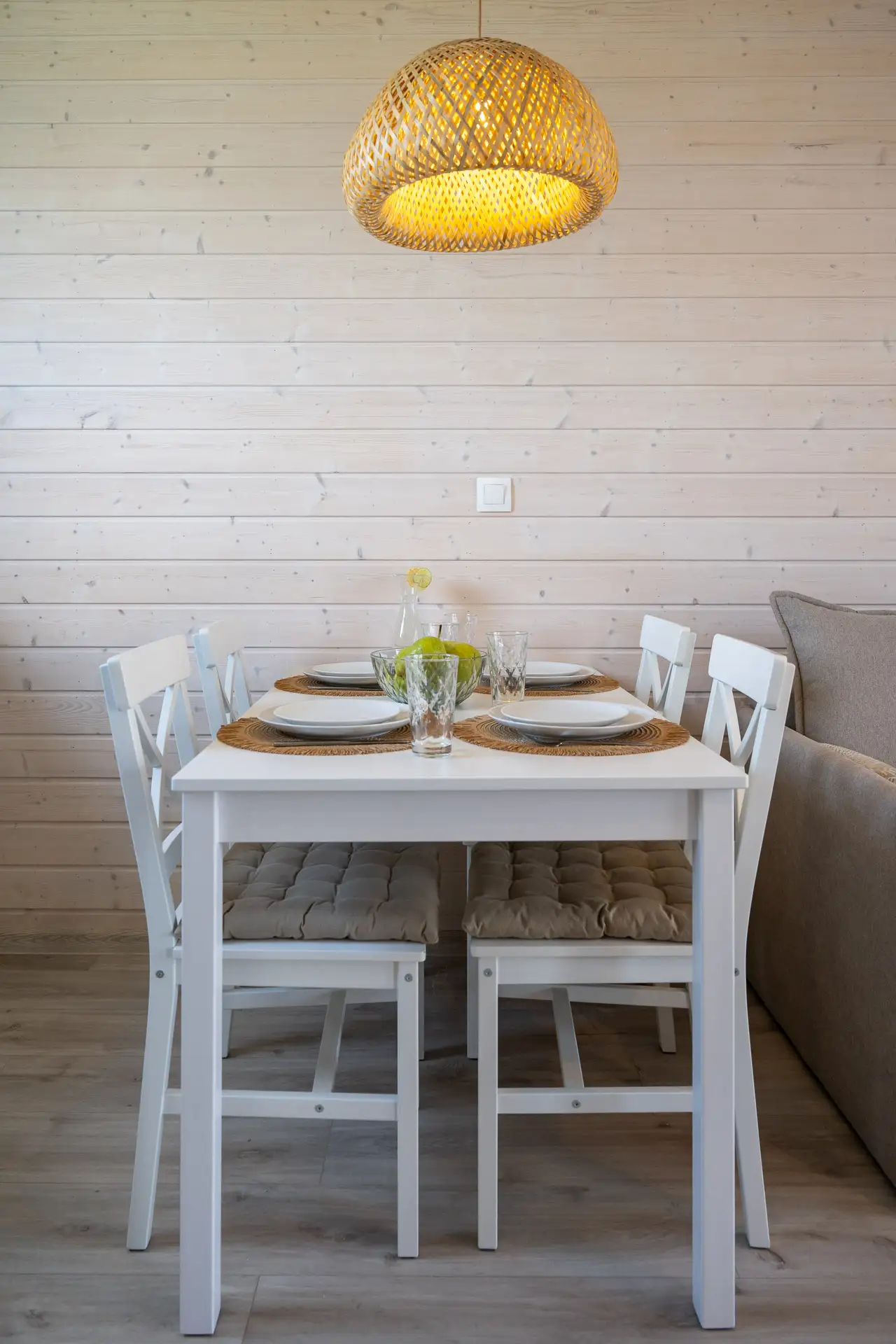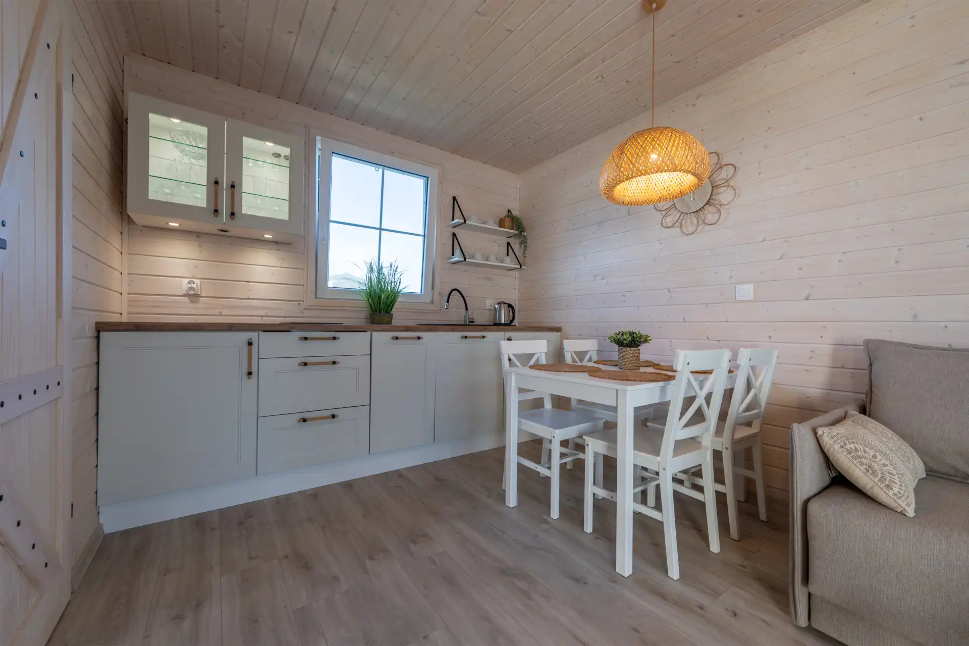 - aneks kuchenny (stół jadalny dla 4 osób, lodówka, płyta indukcyjna 2-palnikowa, zlewozmywak z ociekaczem, zmywarka, garnki, patelnie, czajnik bezprzewodowy, sztućce, talerze, ekspres do kawy),