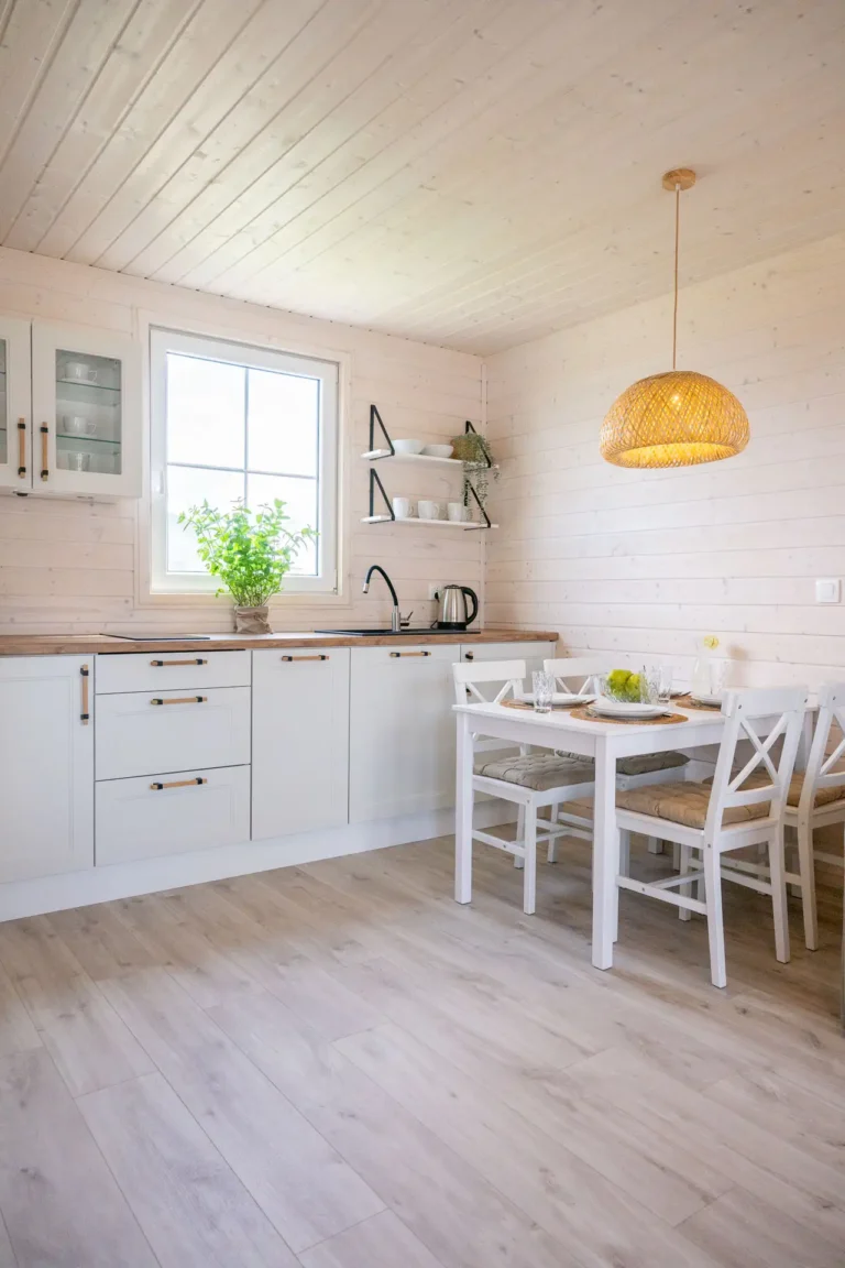 - aneks kuchenny (stół jadalny dla 4 osób, lodówka, płyta indukcyjna 2-palnikowa, zlewozmywak z ociekaczem, zmywarka, garnki, patelnie, czajnik bezprzewodowy, sztućce, talerze, ekspres do kawy),